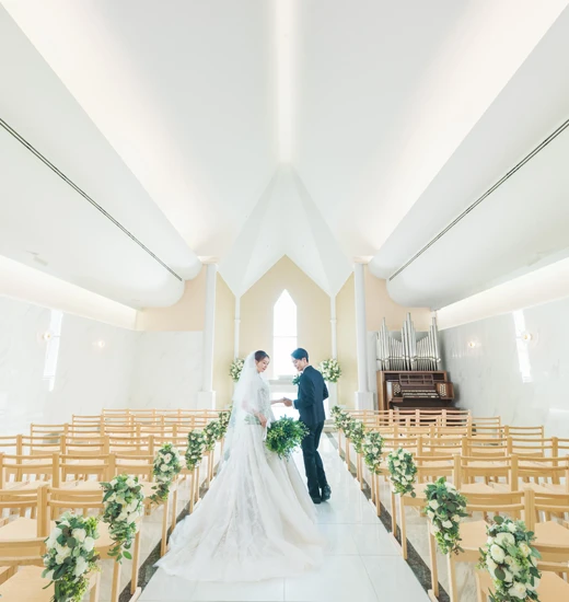 洋と和、どちらの挙式スタイルもお選びいただけます。⾼い天井と11mの⼤理⽯バージンロードを備え、“lumière(ルミエール)=光”をテーマにした⽩基調のチャペル、または伊勢神宮の主祭神・天照⼤神を祀る本格神殿にて、⽇本の伝統を⼤切にした厳かで格調⾼い神前式が叶います。
